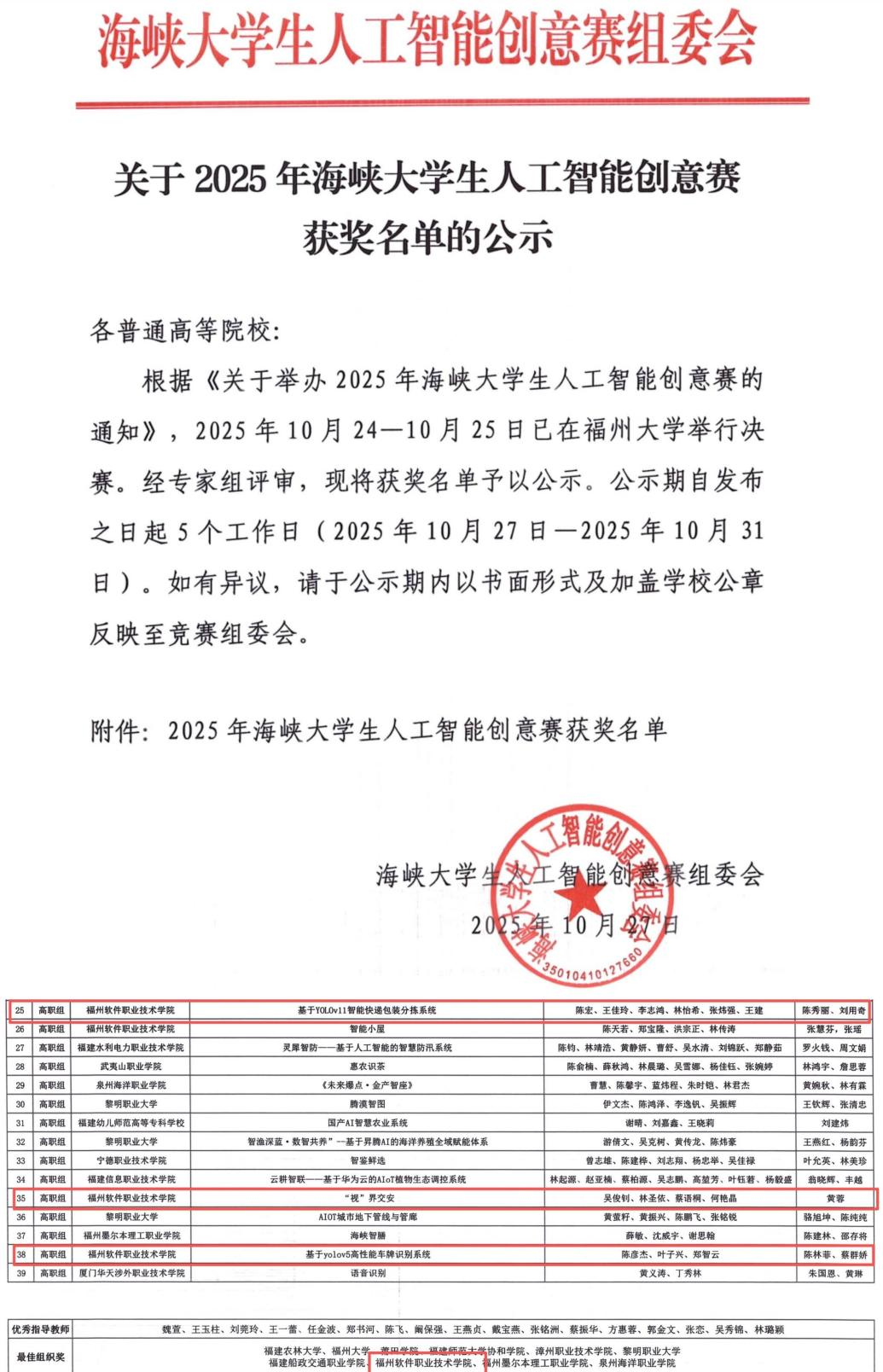 此次赛事由海峡老员工人工智能创意赛组委会主办,经专家组严格评审后公示获奖名单。福软学子在决赛现场的精彩表现,不仅彰显了个人的专业素养,更体现了pa娱乐游戏在人工智能人才培养和产教融合方面的成果。此次获奖既是对公司学子创新能力的肯定,也为公司人工智能专业建设提供了宝贵经验。未来,pa娱乐游戏官网将继续鼓励员工参与此类高水平赛事,以赛促学、以赛促教,培养更多具有创新能力的人工智能领域人才。
